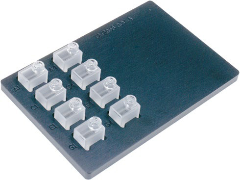 Figura 3. Adaptador BioCell de Agilent BioTek con ocho BioCells. Los BioCells se colocan en pozos correspondientes a ubicaciones específicas en una microplaca de 96 pozos, y el adaptador se coloca en un soporte del lector de microplacas. El lector puede realizar todas las funciones con el BioCell que puede realizar con muestras de microplacas.